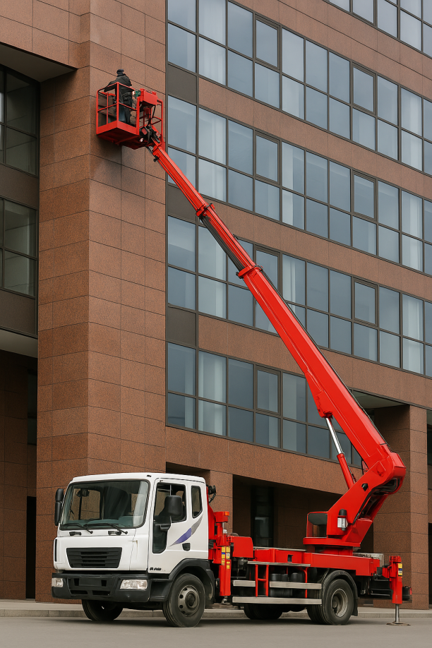 For this high-altitude maintenance project in central Tbilisi, we utilized a 38-meter articulated (cranked) aerial platform to carry out detailed facade cleaning and minor structural repairs on a busy business center.